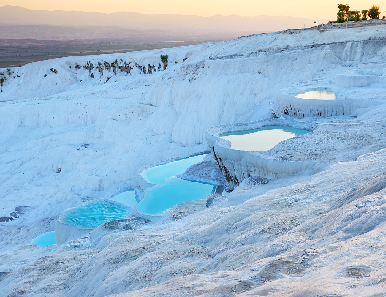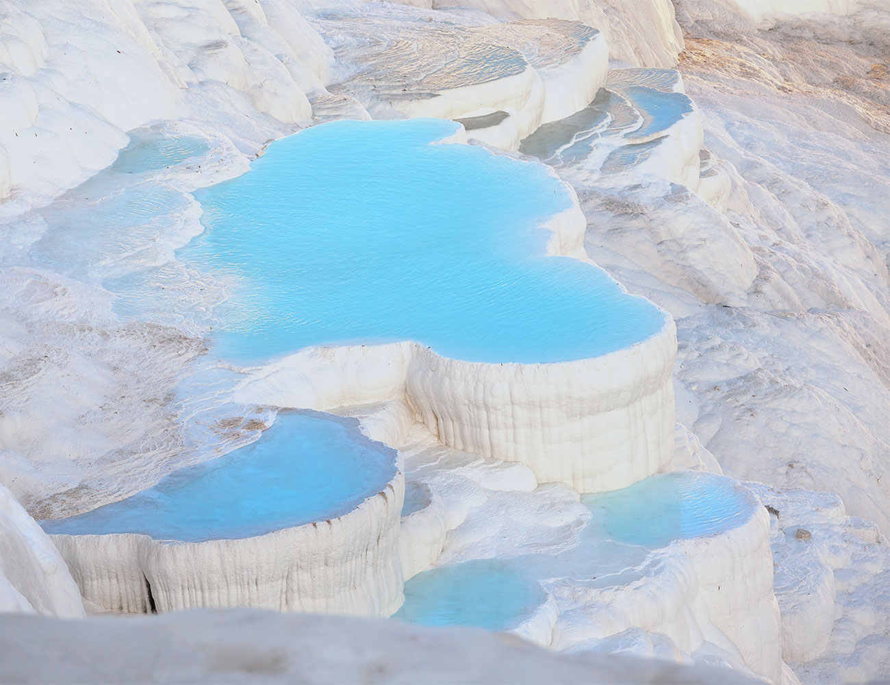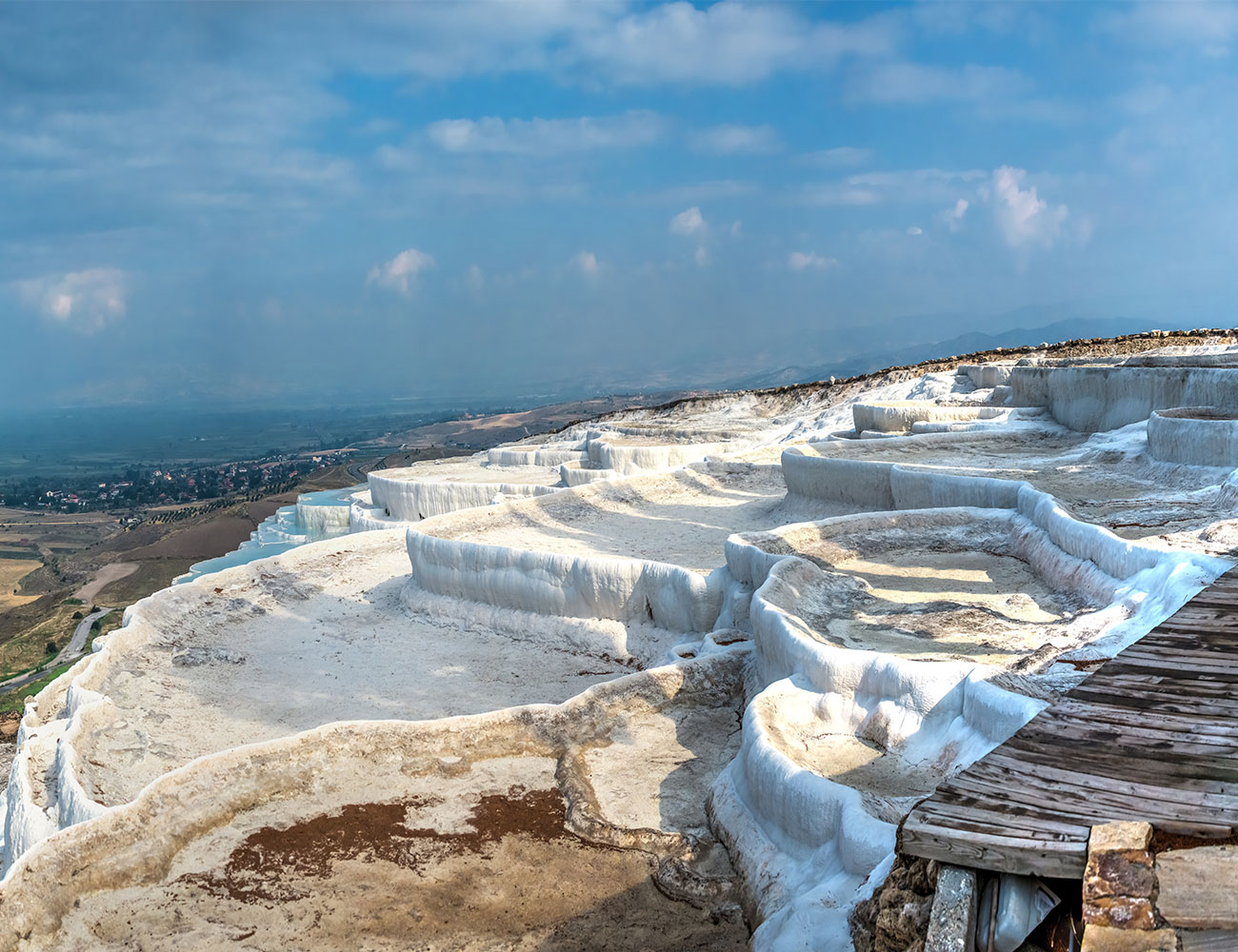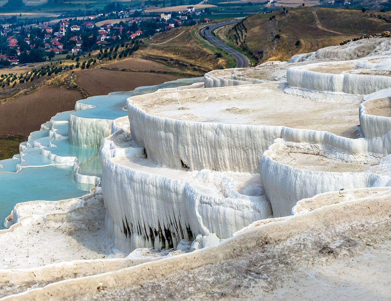 Pamukkale, doğanın ve tarihin eşsiz ve büyüleyici bir manzara yarattığı harikalar diyarıdır. Milyonlarca yıldır Cürüksu Ovası’na bakan bir falezden fışkıran kaplıcalar, geride kalsiyum karbonat bırakarak pamuktan kaleler gibi beyaz traverten terasları oluşturuyor. Türkçe’de “pamuk kalesi” anlamına gelen Pamukkale, dünyanın en dikkate değer doğal miraslarından biridir ve UNESCO Dünya Mirası Alanıdır.